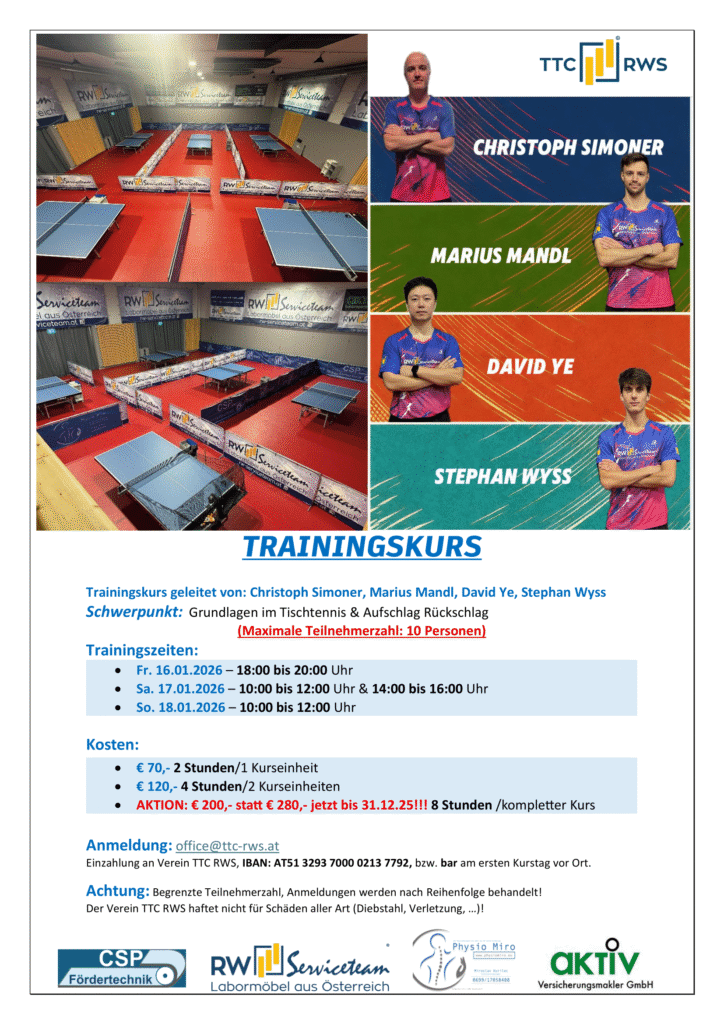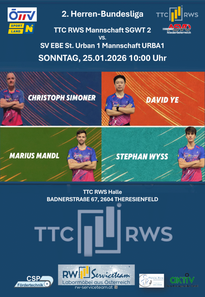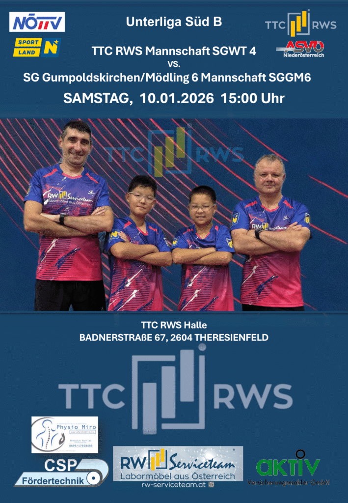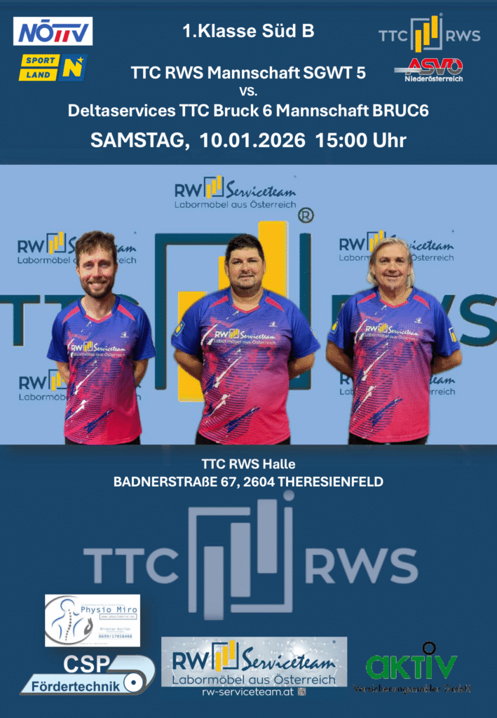 Samstag, 10.01.2026 15:00 in TTC RWS Halle, Theresienfeld TTC RWS Mannschaft SGWT 5 vs. Deltaservices TTC Bruck 6 Mannschaft BRUC6